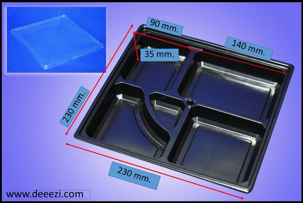 กล่องข้าว 5 ช่อง PP สีดำ พร้อมฝา Size 230x230x35 mm. Microwave oven safe 50 ชิ้น/แพค