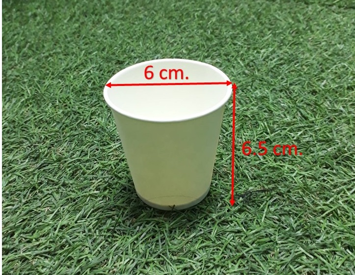แก้วกระดาษขนาด 4 ออนซ์ ไม่มีหูจับ ขนาดปากกว้าง 6 cm. สูง 6.5 cm. บรรจุลังละ 2,000 ใบ