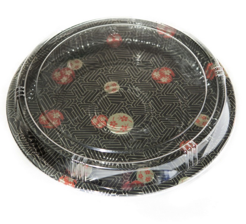 กล่องซูชิกลมลายญี่ปุ่นพร้อมฝาใส Dia240x24mm. แพคละ 50 ชิ้น ลังละ 150 ชิ้น